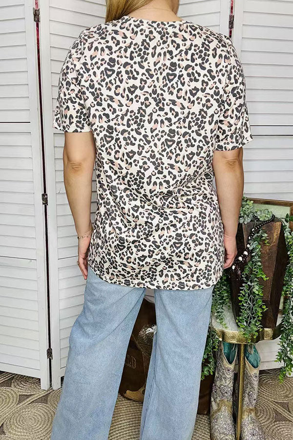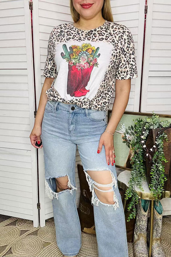 Top features western boots & floral and cactus prints on leopard background with short sleeves.
