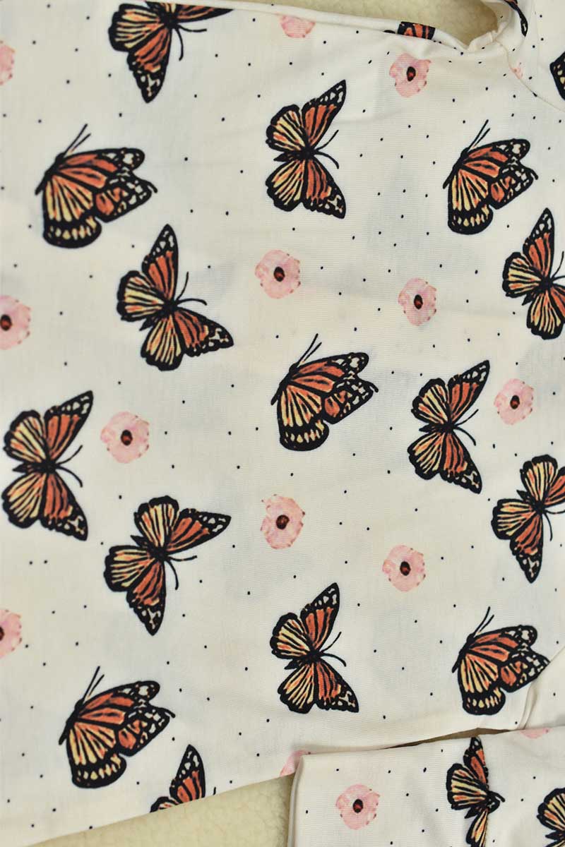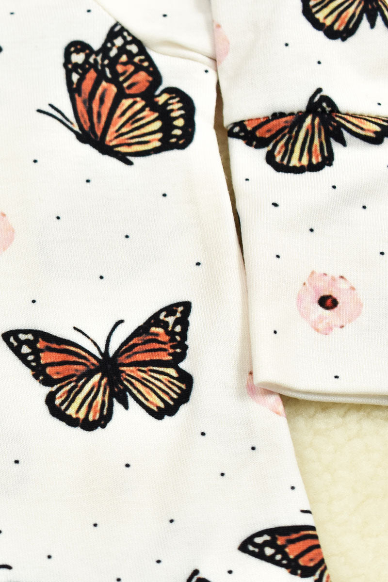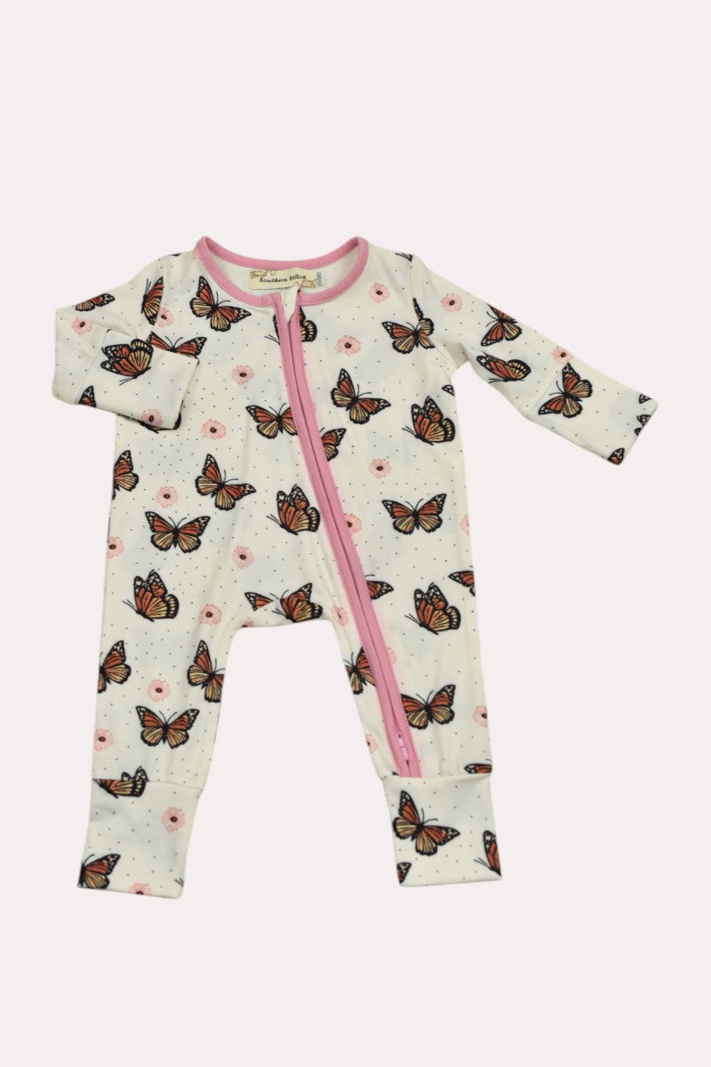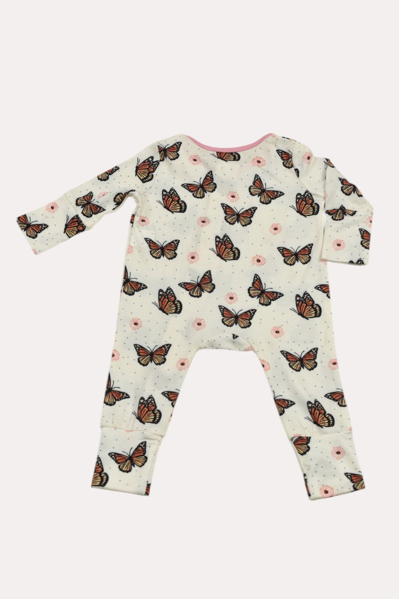 Romper features with butterfly printed on white background with pink trim & duouble full zippers.