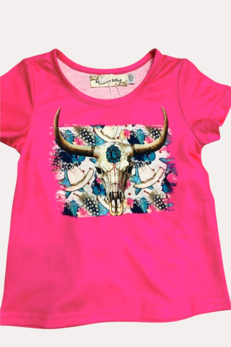 Top features with bull skull & floral printed on hot pink background with short sleeves.