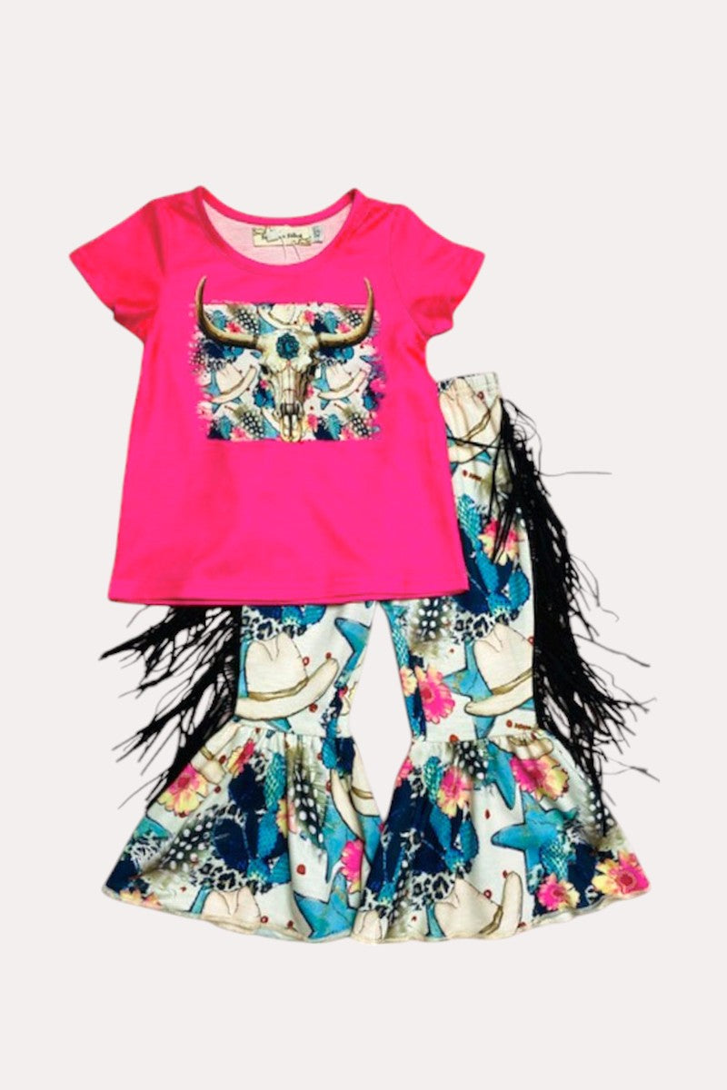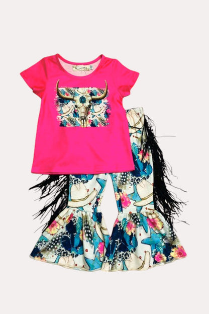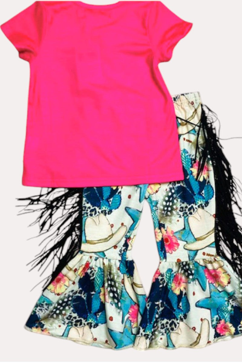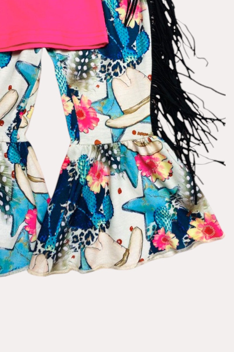 Western printed bell bottom pant & black tassels to match with the top as a set.