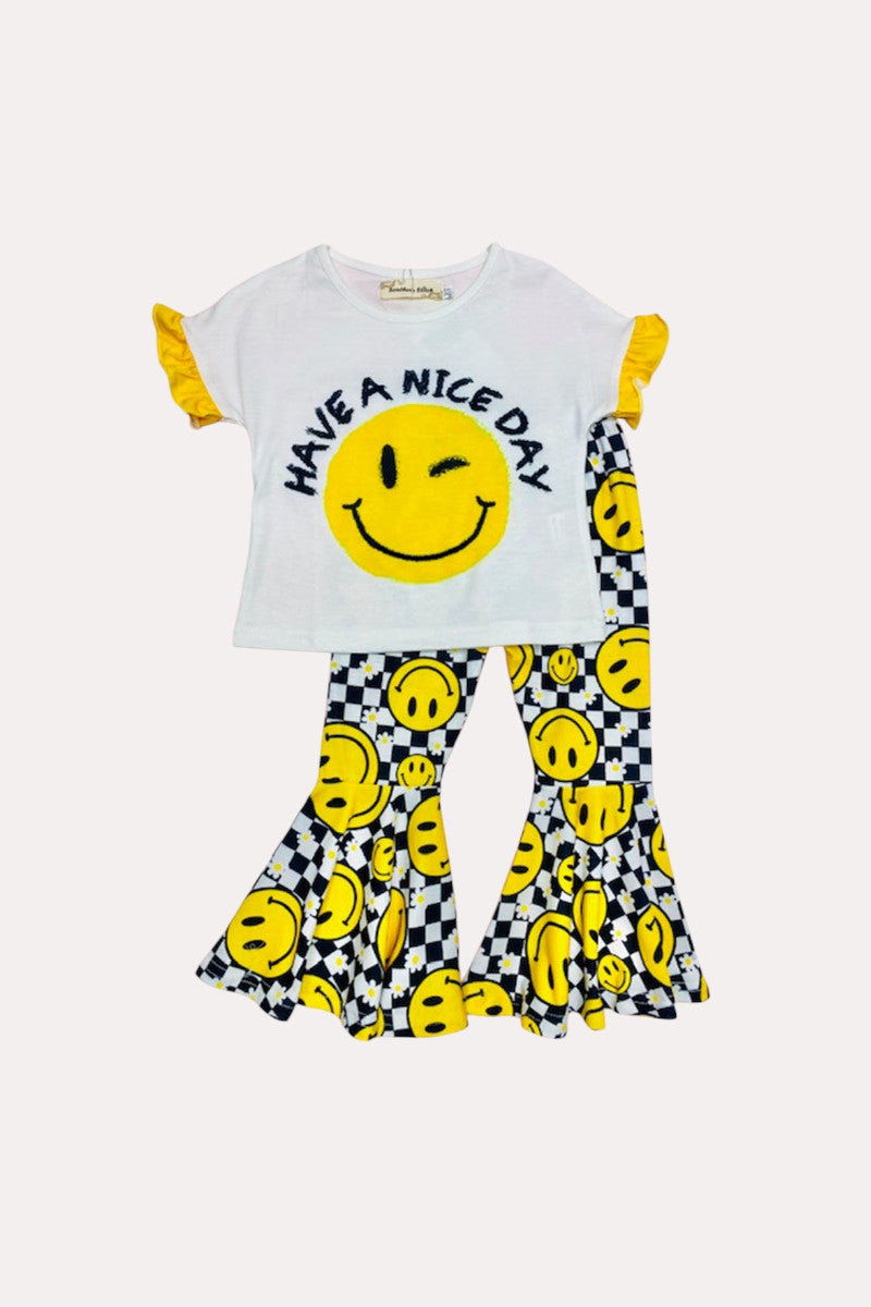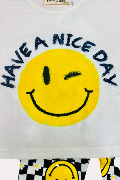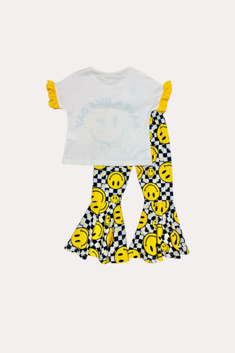 - Top features smile face printed on white backgroudn with yellow ruffles short sleeve.