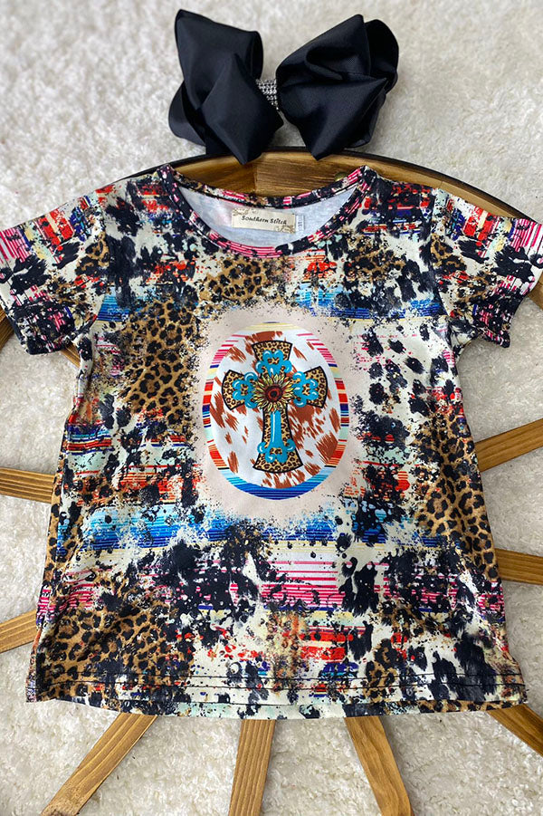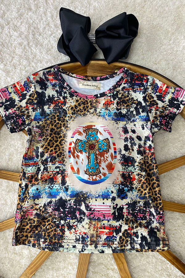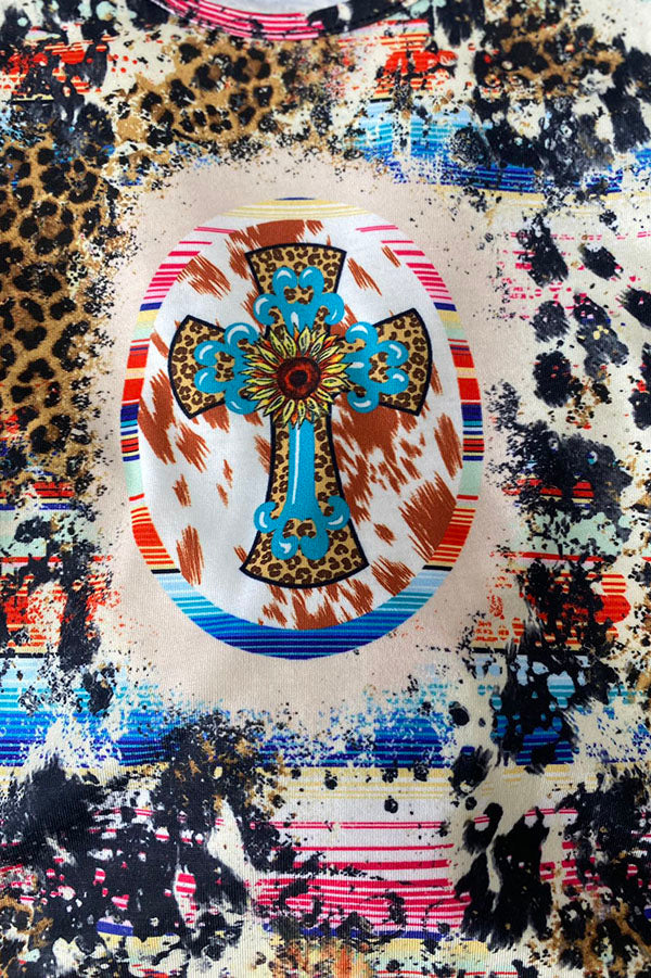 - Top features sunflower & cross printed on tie dye background with short sleeve.
