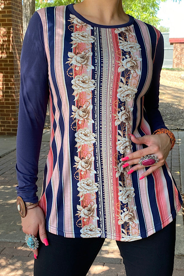 XCH10281 Rose/multi color striped long sleeve top