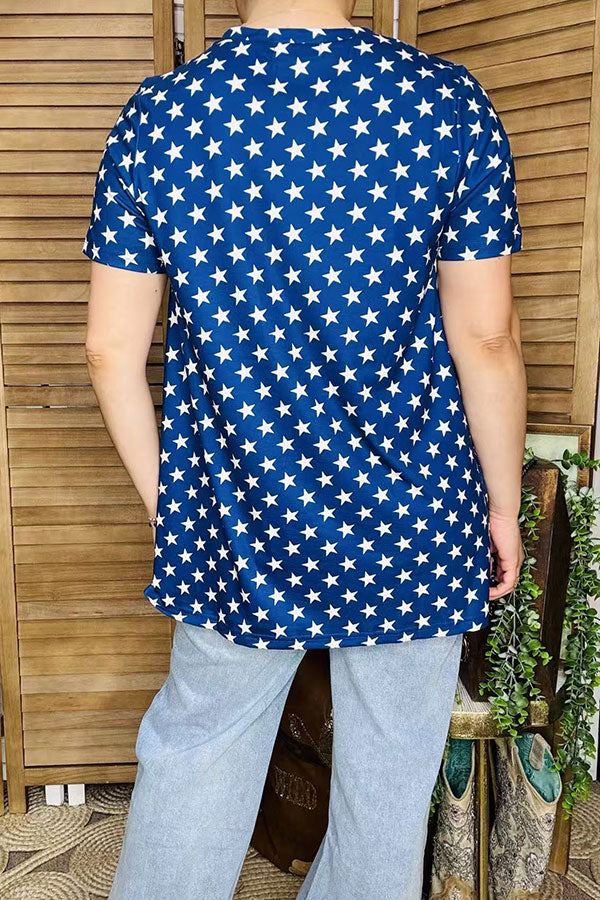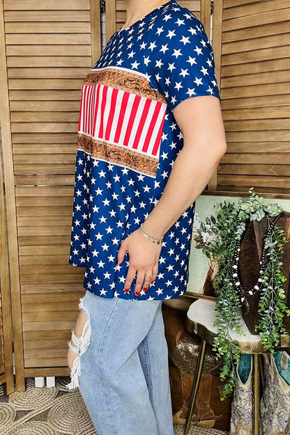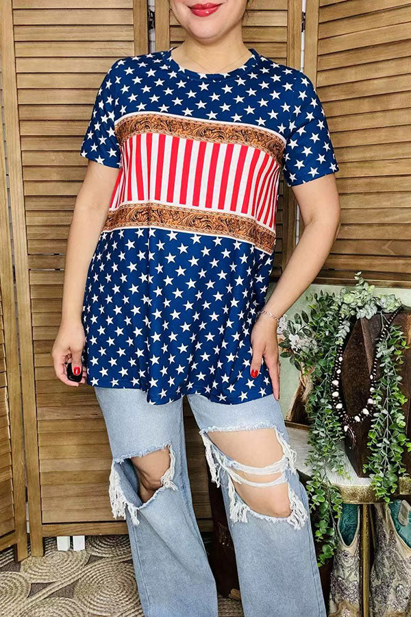 Top features with blue stars & brown paisley & red/white stripes color block with short sleeves.