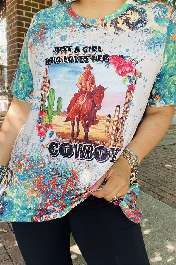 - Top features wording "JUST A GIRL WHO LOVES HER COWBOY" & hiding horse printed with short sleeves.