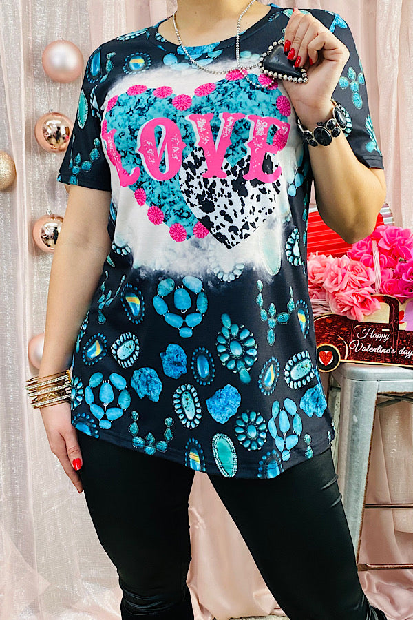 XCH12892 LOVE Black & turquoise jewel printed short sleeve top