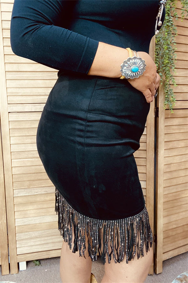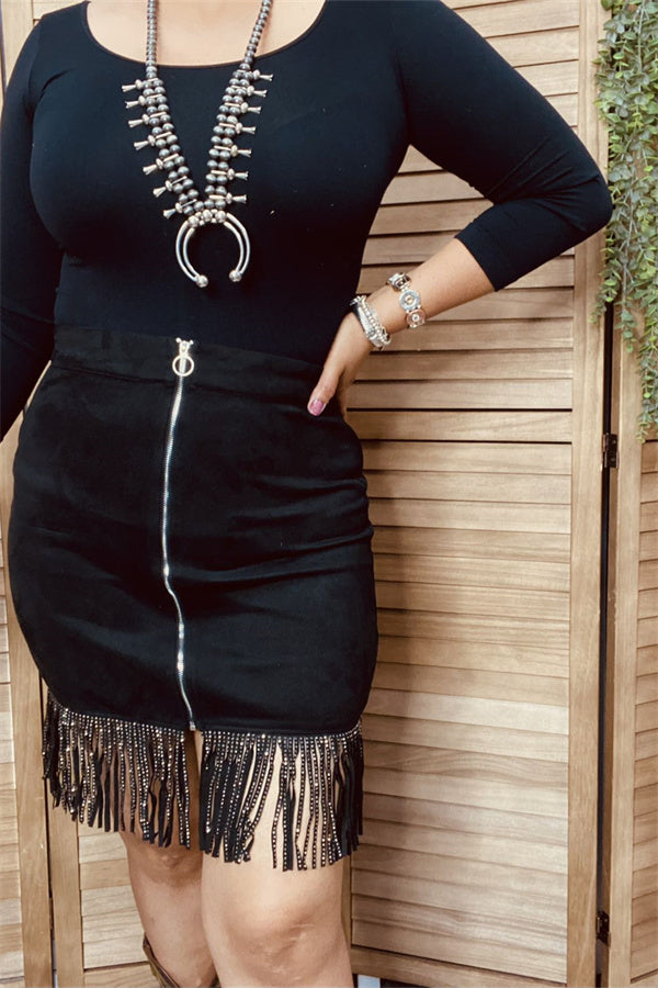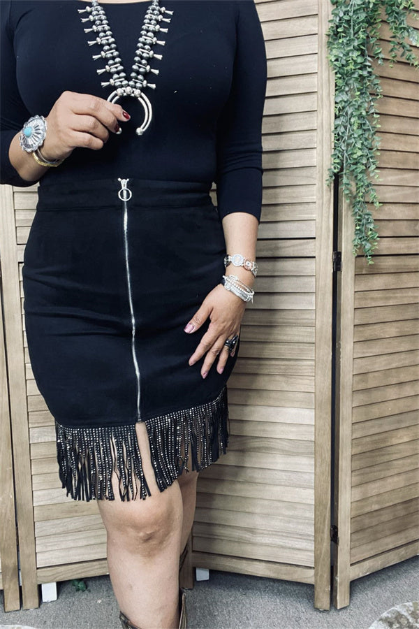XCH13307 Black printed rhinestone fringe w/white zipper tighten skirt for women