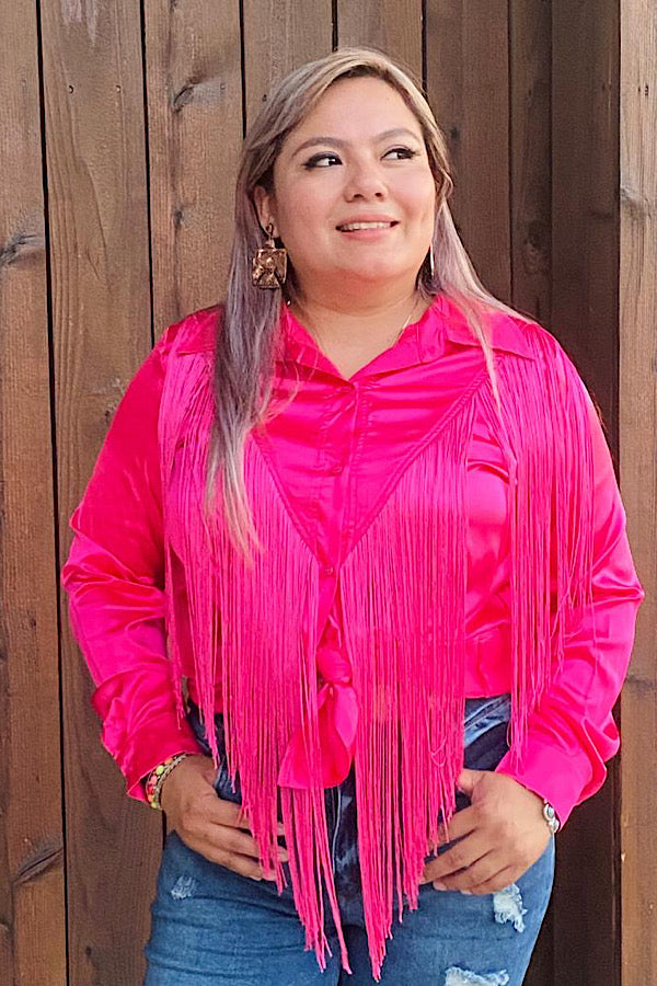 XCH13345 Pink button up long sleeve blouse w/fringe tassels