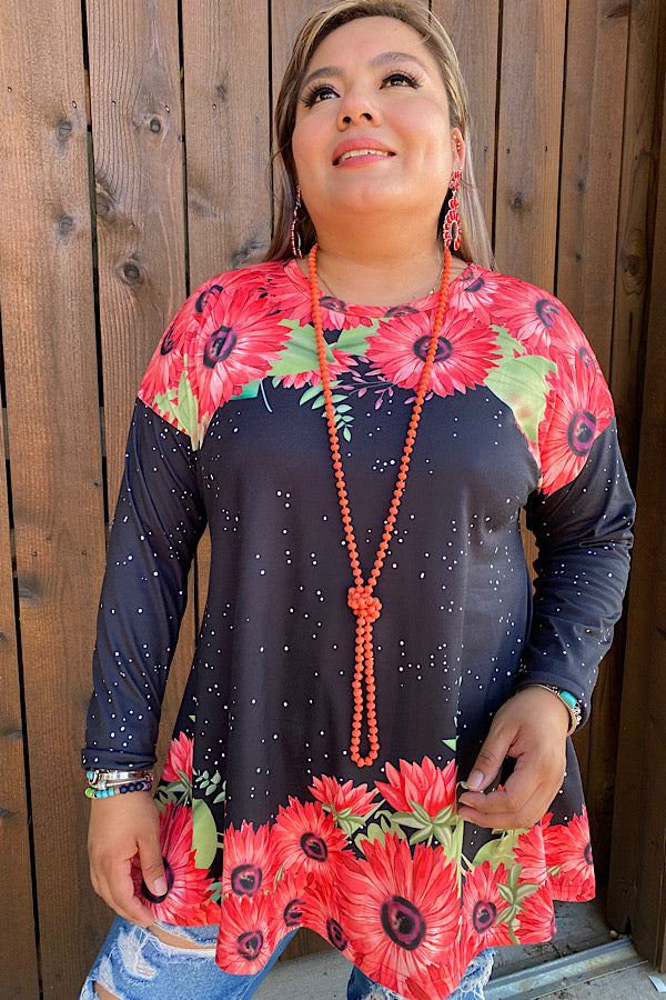 XCH13659 BLACK & RED SUNFLOWER PRINT LONG SLEEVE TOP