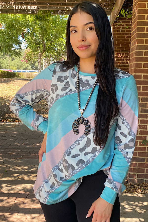 XCH13738 BABY BLUE LEOPARD,GLITTER PRINT LONG SLEEVE TOP