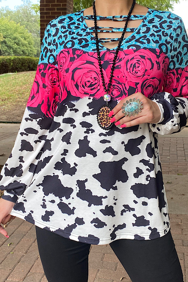 XCH13792 TURQUOISE LEOPARD ROSES,COW PRINT LONG SLEEVE TOP