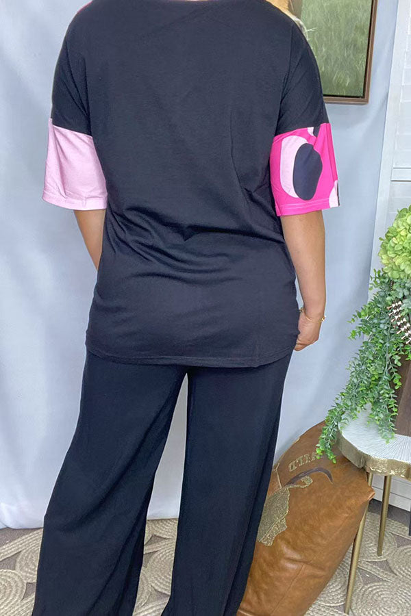 Top features with half black & fuchsia and pink leopard printed with drop shoulder for women's clothing wholesale.